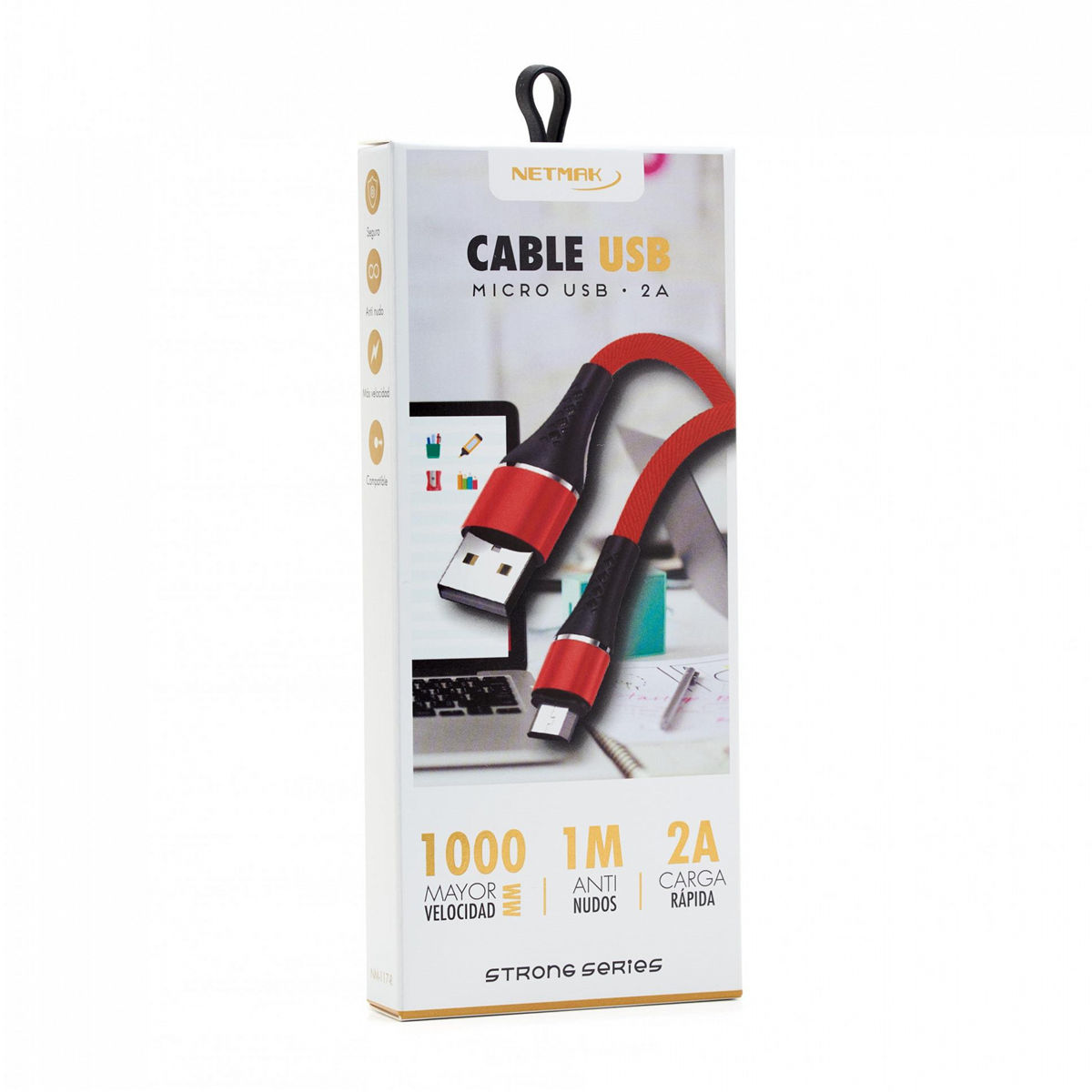 CABLE MICRO USB 2 A 1 METRO EN CAJITA NETMAK COLOR ROJO