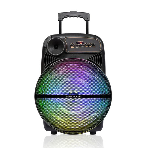 Conexion inalambrica BT. TWS-Estereo Inalambrico Real. Efectos de luces LED. Pantalla LED. Boton del ecualizador. Radio FM. Tarjeta USB / TF. Entrada AUX. Bateria recargable. Entrada de microfono. Medida del parlante: 15″. Bateria: 1800 mAh. Ruedas y manija. 12W de potencia de salida.